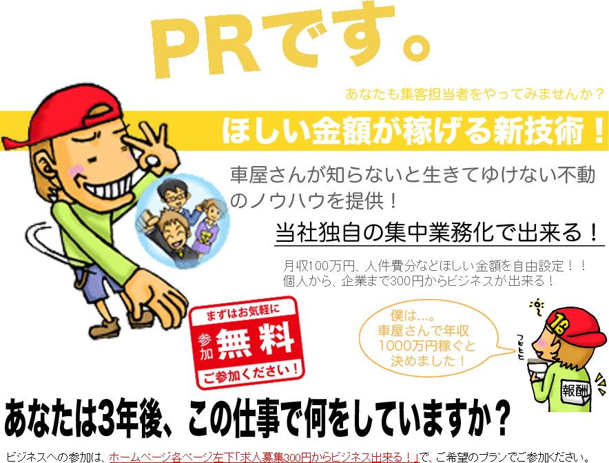 | ここにくれば必ず得をする!日本中で車に乗る方全ての方にご利用頂きたいという大きな目標を掲げこの体制が生まれました。 職場でも、恋人でもご近所の方にまで是非紹介をお願いします。 |
