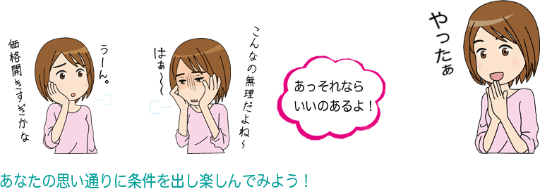 | 当初お出しした基本価格帯の車や、交換に応じてくれそうな車を狙うのも早期にお気に入りを見つけるポイントです。 同じ価格帯の車や、交換に応じてくれそうな車を狙い希望条件を出してみましょう。 希望条件は係員に伝えるだけで、あなたのご希望条件が満たされやすくなります。 どんどん条件を出してみましょう。 |